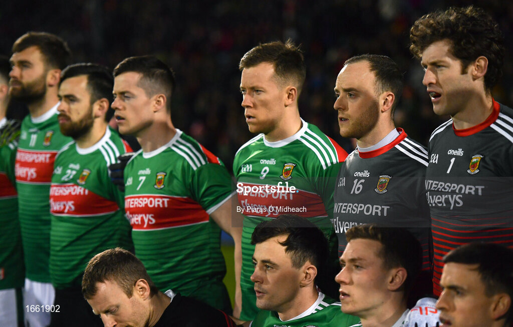 2 March 2019; Mayo substitute goalkeeper Micheál Schlingermann, second from right, before the Allianz Football League Division 1 Round 5 match between Mayo and Galway at Elverys MacHale Park in Castlebar, Mayo. Photo by Piaras Ó Mídheach/Sportsfile