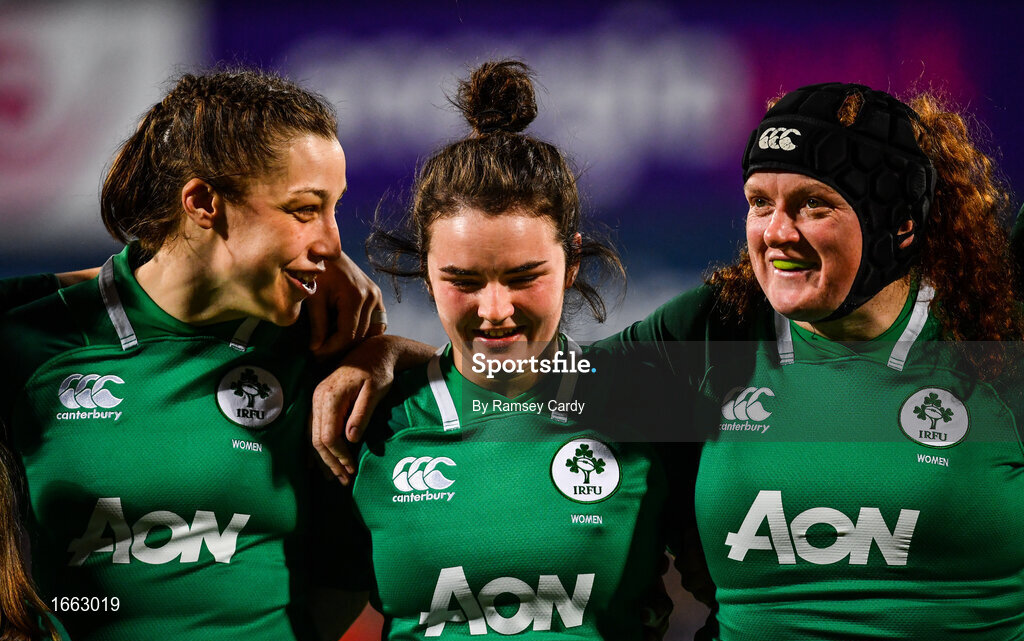 9 March 2019; Nichola Fryday, left, Deirbhile Nic a Bhaird, centre, and Fiona Reidy of Ireland ahead of the Women's Six Nations Rugby Championship match between Ireland and France at Energia Park in Donnybrook, Dublin. Photo by Ramsey Cardy/Sportsfile