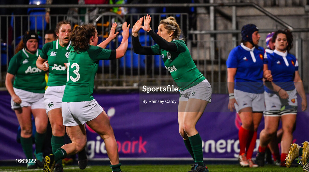 9 March 2019; Alison Miller of Ireland celebrates her side's first try with Enya Breen, left, during the Women's Six Nations Rugby Championship match between Ireland and France at Energia Park in Donnybrook, Dublin. Photo by Ramsey Cardy/Sportsfile