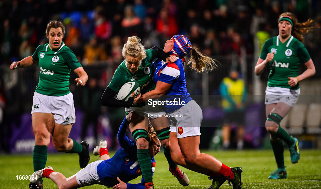 9 March 2019; Claire Molloy of Ireland is tackled by Pauline Bourdon, left, and Caroline Thomas of France during the Women's Six Nations Rugby Championship match between Ireland and France at Energia Park in Donnybrook, Dublin. Photo by Ramsey Cardy/Sportsfile