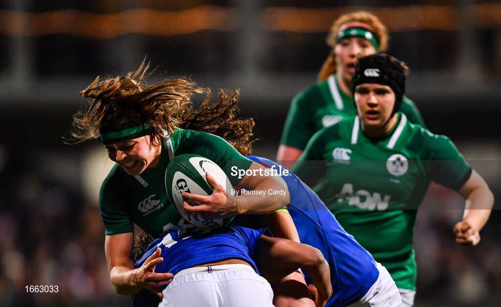 9 March 2019; Claire McLaughlin of Ireland is tackled by Yolaine Yengo, left, and Caroline Boujard of France during the Women's Six Nations Rugby Championship match between Ireland and France at Energia Park in Donnybrook, Dublin. Photo by Ramsey Cardy/Sportsfile