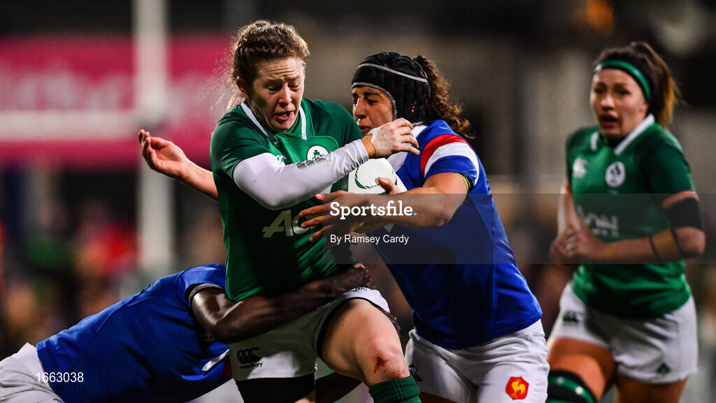 9 March 2019; Lauren Delany of Ireland is tackled by Yolaine Yengo, left, and Caroline Boujard of France during the Women's Six Nations Rugby Championship match between Ireland and France at Energia Park in Donnybrook, Dublin. Photo by Ramsey Cardy/Sportsfile