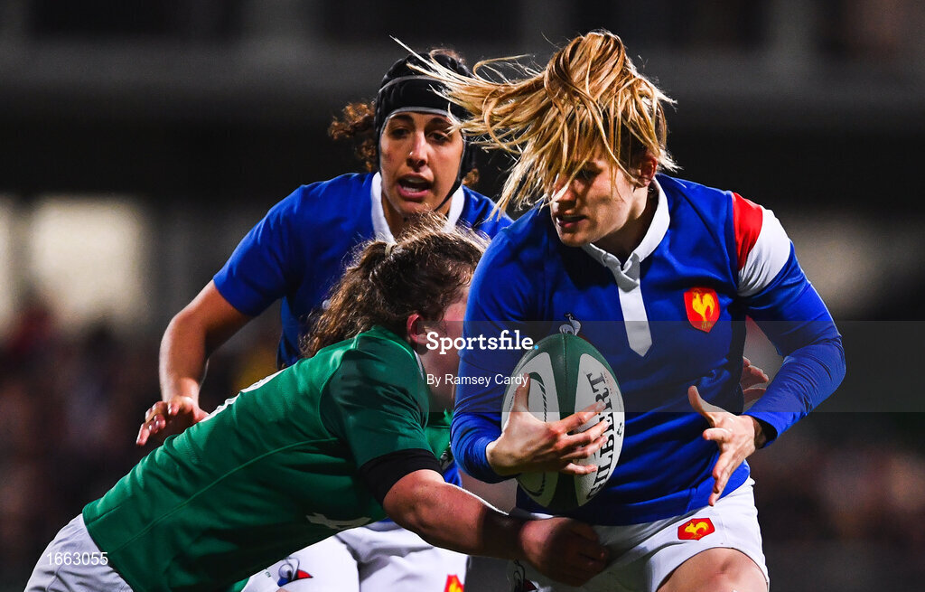 9 March 2019; Gaelle Hermet of France is tackled by Enya Breen of Ireland during the Women's Six Nations Rugby Championship match between Ireland and France at Energia Park in Donnybrook, Dublin. Photo by Ramsey Cardy/Sportsfile