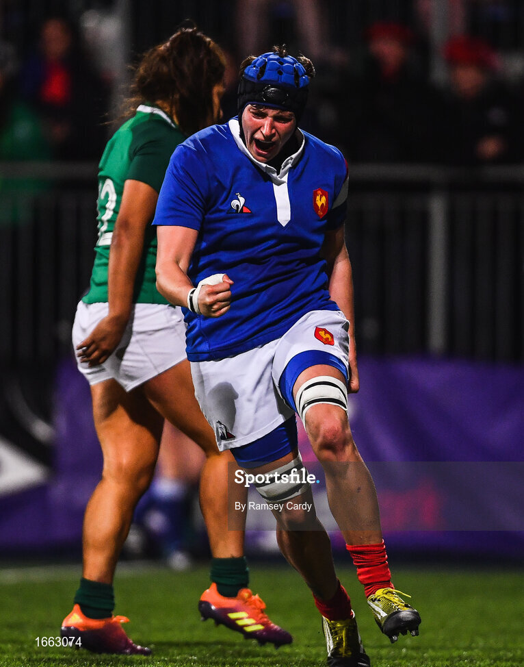 9 March 2019; Audrey Forlani of France celebrates after scoring her side's sixth try during the Women's Six Nations Rugby Championship match between Ireland and France at Energia Park in Donnybrook, Dublin. Photo by Ramsey Cardy/Sportsfile