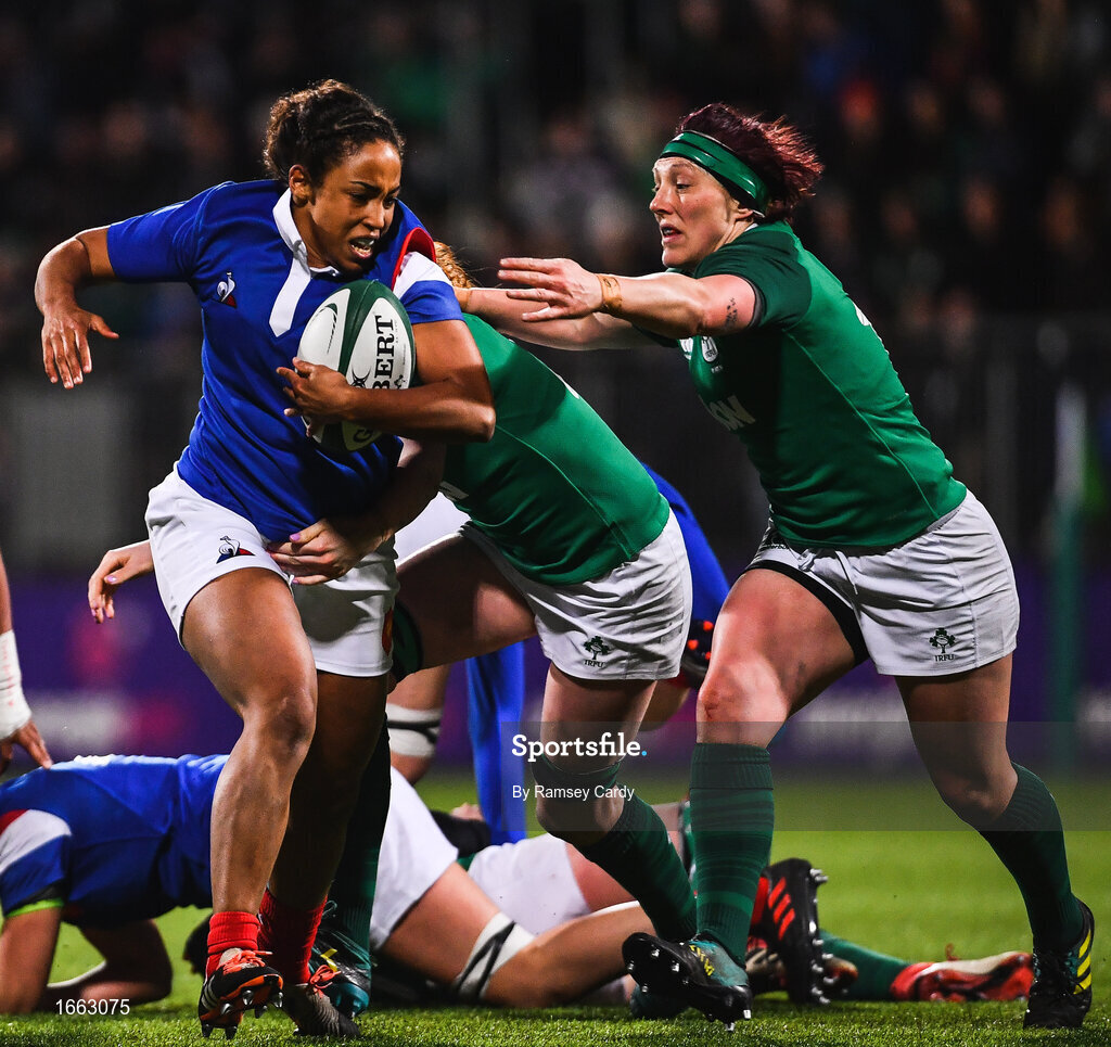 9 March 2019; Mailys Traore of France is tackled by Lindsay Peat of Ireland during the Women's Six Nations Rugby Championship match between Ireland and France at Energia Park in Donnybrook, Dublin. Photo by Ramsey Cardy/Sportsfile