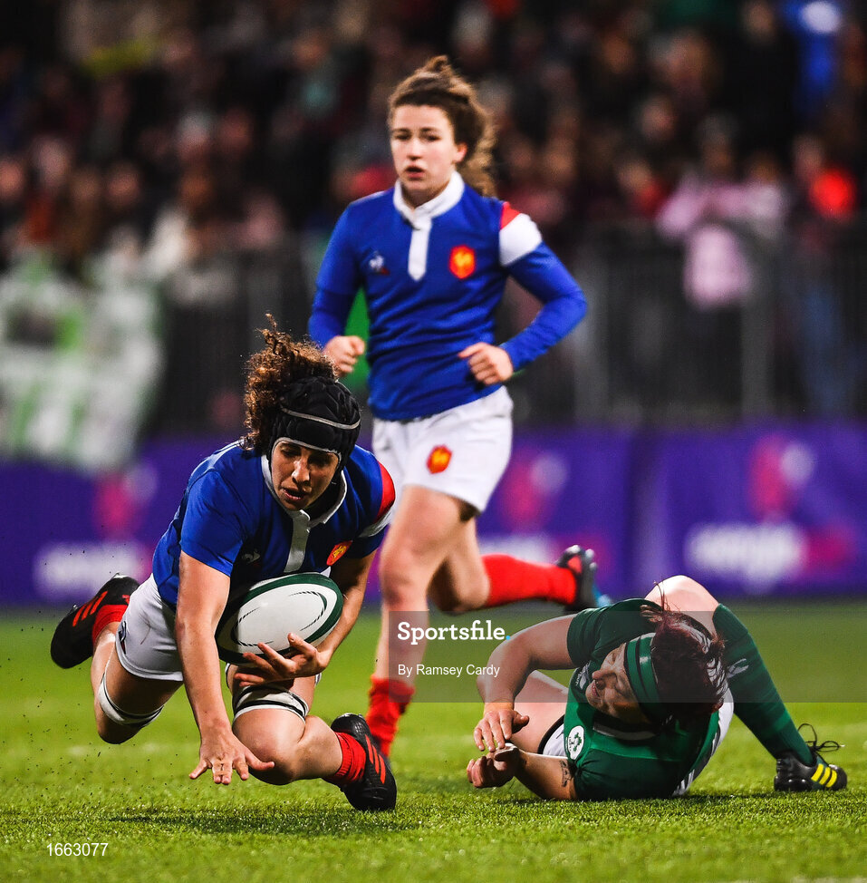 9 March 2019; Celine Ferer of France in action against Lindsay Peat of Ireland during the Women's Six Nations Rugby Championship match between Ireland and France at Energia Park in Donnybrook, Dublin. Photo by Ramsey Cardy/Sportsfile