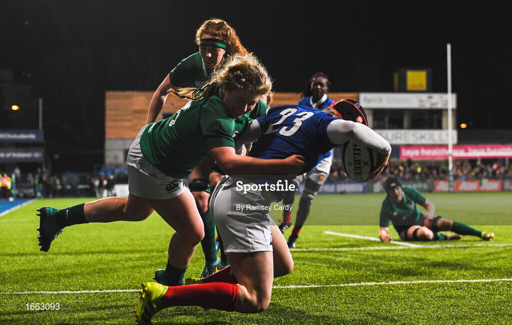 9 March 2019; Marine Menager of France dives over to score her side's seventh try despite the tackle by Emma Hooban of Ireland during the Women's Six Nations Rugby Championship match between Ireland and France at Energia Park in Donnybrook, Dublin. Photo by Ramsey Cardy/Sportsfile