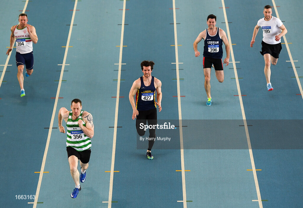 10 March 2019; Ronnie Warde of Castlegar A.C., second left, on his way to winning the 60m during the Irish Life Health Masters Indoors Championships at AIT in Athlone, Co Westmeath. Photo by Harry Murphy/Sportsfile
