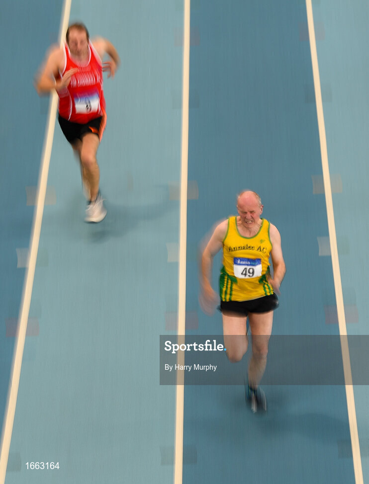 10 March 2019; Paul Connolly of Annalee A.C., right, competing in the 60m during the Irish Life Health Masters Indoors Championships at AIT in Athlone, Co Westmeath. Photo by Harry Murphy/Sportsfile