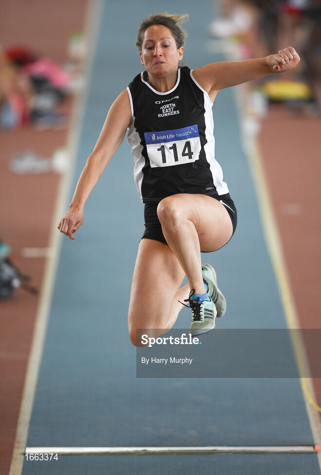 10 March 2019; Rosemary Gibson of North East Runners A.C. competing in the Long Jump during the Irish Life Health Masters Indoors Championships at AIT in Athlone, Co Westmeath. Photo by Harry Murphy/Sportsfile