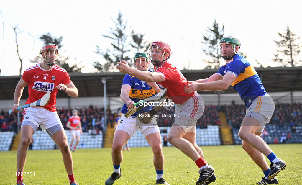 10 March 2019; Bill Cooper with the support of his Cork team-mate Stephen McDonnell, left, in action against John O’Dwyer and Noel McGrath, right, of Tipperary during the Allianz Hurling League Division 1A Round 5 match between Cork and Tipperary at Páirc Uí Rinn in Cork. Photo by Stephen McCarthy/Sportsfile