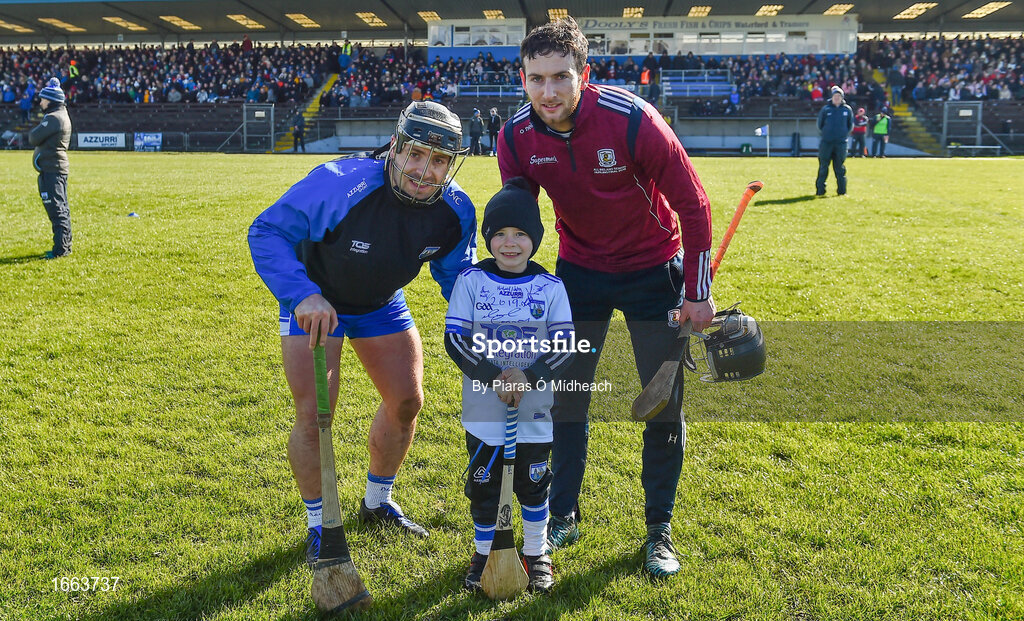 10 March 2019; Club Déise mascot Oisín Fogarty, age 6, from Ballycullane, Dungarvan with Waterford captain Noel Connors and Galway captain Pádraic Mannion before the Allianz Hurling League Division 1B Round 5 match between Waterford and Galway at Walsh Park in Waterford. Photo by Piaras Ó Mídheach/Sportsfile