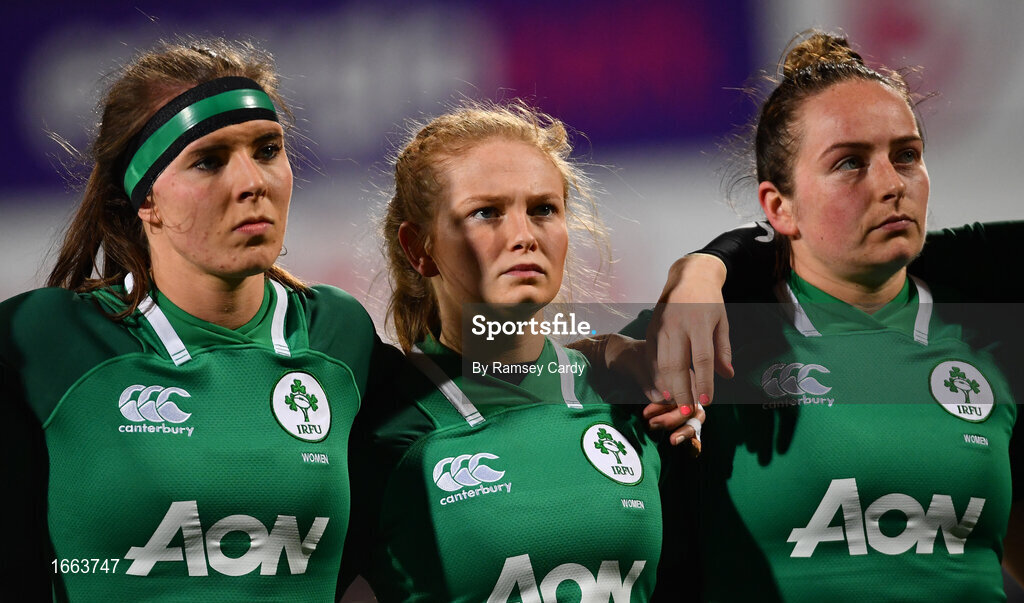 9 March 2019; Claire McLaughlin, left, Kathryn Dane, centre, and Nicole Fowley of Ireland during the Women's Six Nations Rugby Championship match between Ireland and France at Energia Park in Donnybrook, Dublin. Photo by Ramsey Cardy/Sportsfile