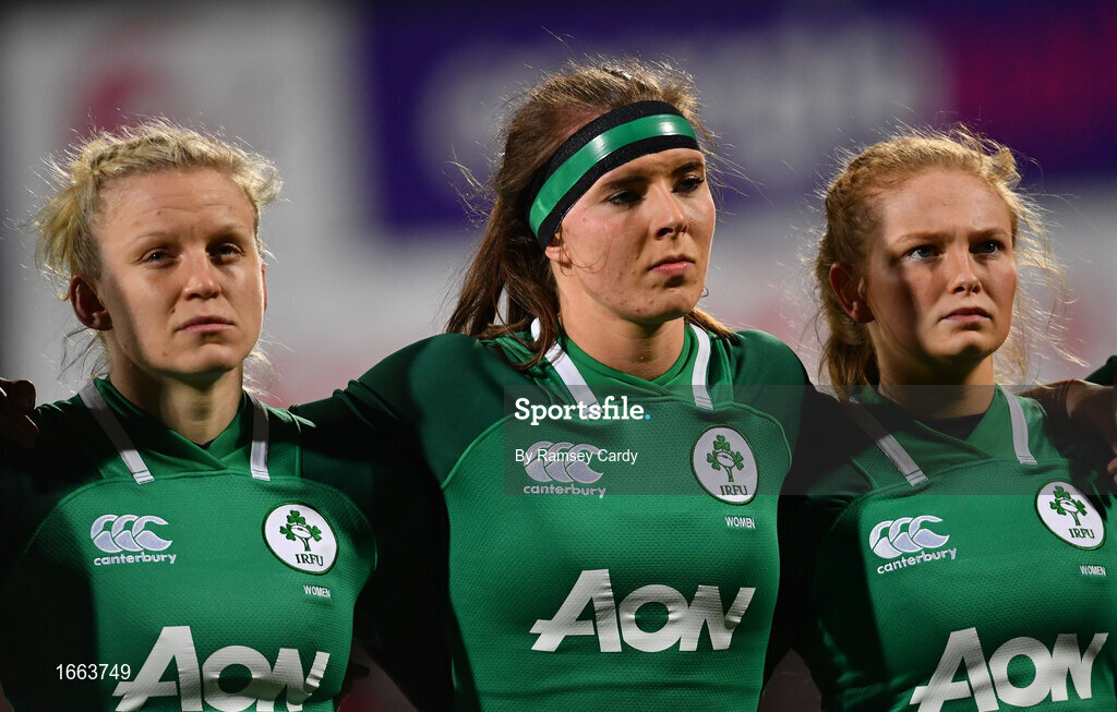 9 March 2019; Claire Molloy, left, Claire McLaughlin, centre, and Kathryn Dane of Ireland during the Women's Six Nations Rugby Championship match between Ireland and France at Energia Park in Donnybrook, Dublin. Photo by Ramsey Cardy/Sportsfile