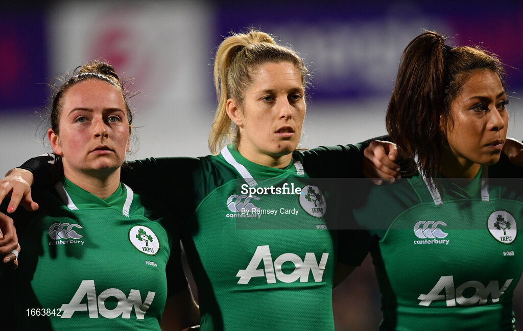9 March 2019; Nicole Fowley, left, Alison Miller, centre, and Sene Naoupu of Ireland during the Women's Six Nations Rugby Championship match between Ireland and France at Energia Park in Donnybrook, Dublin. Photo by Ramsey Cardy/Sportsfile