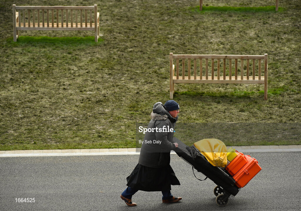 13 March 2019; A bookmaker makes his way to his pitch prior to racing on Day Two of the Cheltenham Racing Festival at Prestbury Park in Cheltenham, England. Photo by Seb Daly/Sportsfile