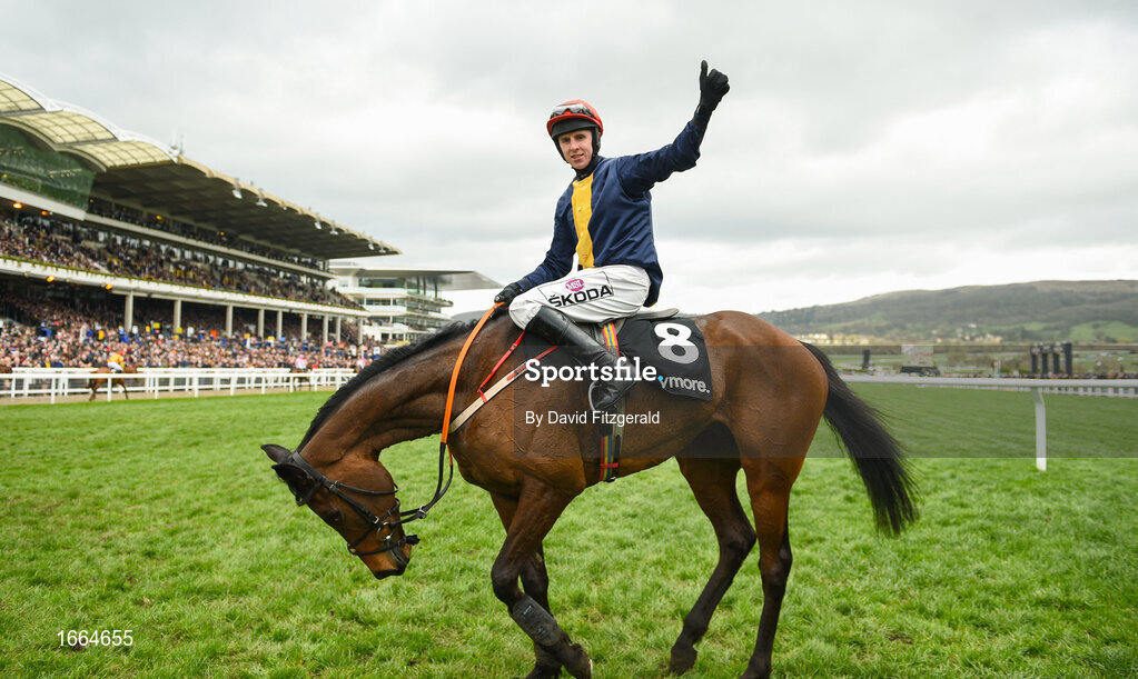 13 March 2019; Mark Walsh celebrates on City Island after winning the Ballymore Novices' Hurdle on Day Two of the Cheltenham Racing Festival at Prestbury Park in Cheltenham, England. Photo by David Fitzgerald/Sportsfile