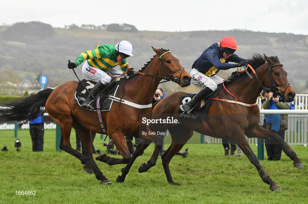 13 March 2019; City Island, right, with Mark Walsh up, races alongside Champ, with Barry Geraghty up, on their way to winning the Ballymore Novices' Hurdle on Day Two of the Cheltenham Racing Festival at Prestbury Park in Cheltenham, England. Photo by Seb Daly/Sportsfile