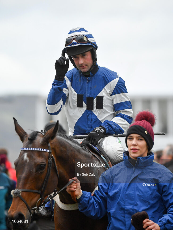 13 March 2019; Jockey Nico de Boinville celebrates as he enters the winners enclosure after winning the Coral Cup Handicap Hurdle on William Henry on Day Two of the Cheltenham Racing Festival at Prestbury Park in Cheltenham, England. Photo by Seb Daly/Sportsfile