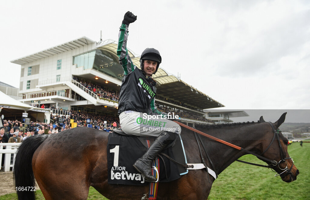 13 March 2019; Nico de Boinville celebrates on Altior after winning the Betway Queen Mother Champion Chase on Day Two of the Cheltenham Racing Festival at Prestbury Park in Cheltenham, England. Photo by David Fitzgerald/Sportsfile