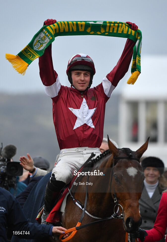 13 March 2019; Jockey Keith Donoghue celebrates as he enters the winners enclosure after winning the Glenfarclas Cross Country Chase on Tiger Roll on Day Two of the Cheltenham Racing Festival at Prestbury Park in Cheltenham, England. Photo by Seb Daly/Sportsfile