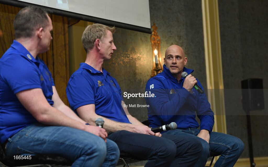 14 March 2019; Leinster backs Coach Felipe Contepomi with head coach Leo Cullen, and Leinster Communications Manager Marcus Ó Buachalla at an exclusive Questions & Answers session with Leinster Rugby Season Ticket Holders at the InterContinental Dublin. Photo by Matt Browne/Sportsfile