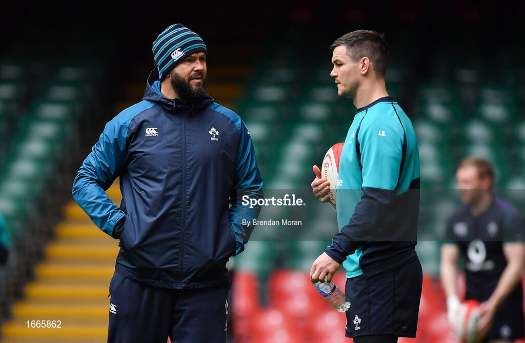 15 March 2019; Jonathan Sexton, right, with defence coach Andy Farrell during the Ireland rugby captain's run at the Principality Stadium in Cardiff, Wales. Photo by Brendan Moran/Sportsfile