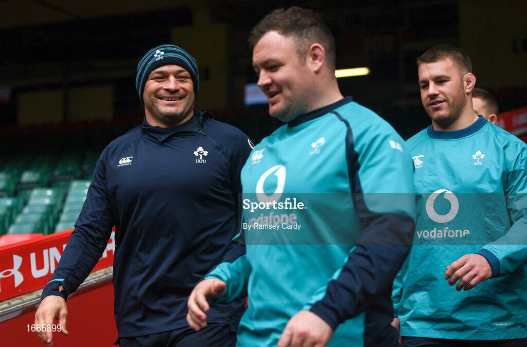 15 March 2019; Rory Best, left, during the Ireland rugby captain's run at the Principality Stadium in Cardiff, Wales. Photo by Ramsey Cardy/Sportsfile