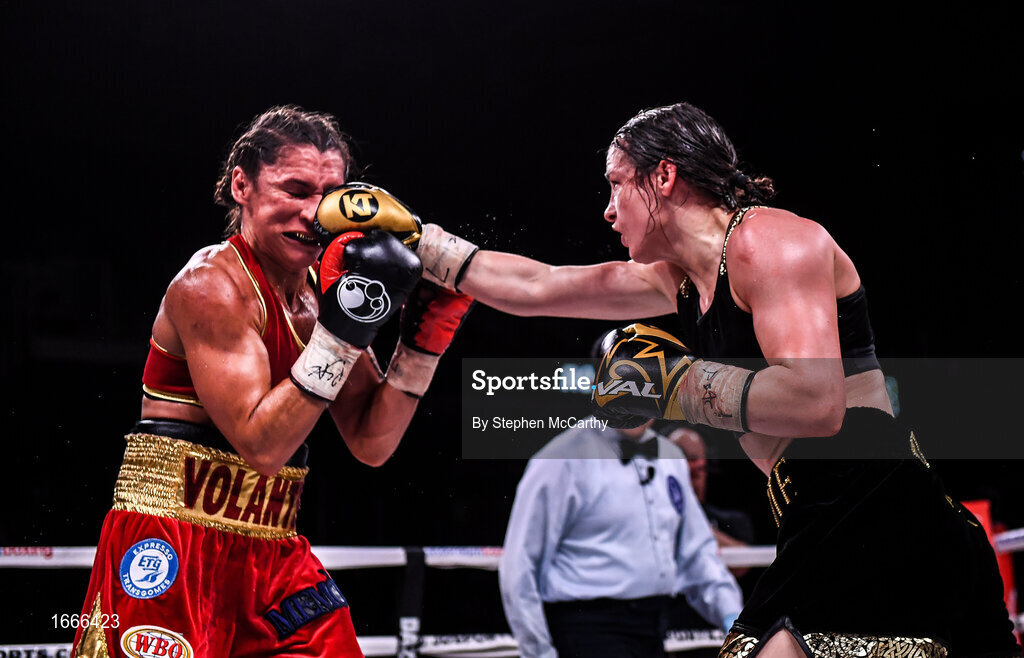 15 March 2019; Katie Taylor, right, and Rose Volante during their WBA, IBF & WBO Female Lightweight World Championships unification bout at the Liacouras Center in Philadelphia, USA. Photo by Stephen McCarthy / Sportsfile