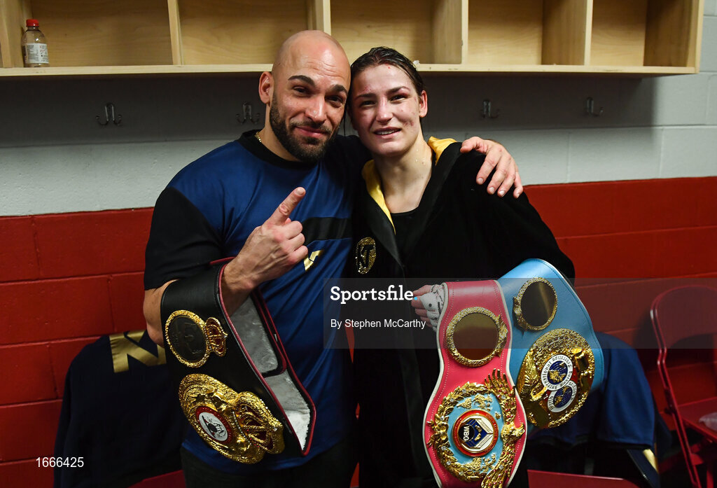 15 March 2019; Katie Taylor celebrates in her dressing room, with her coach Ross Enamait, after defeating Rose Volante in their WBA, IBF & WBO Female Lightweight World Championships unification bout at the Liacouras Center in Philadelphia, USA. Photo by Stephen McCarthy / Sportsfile