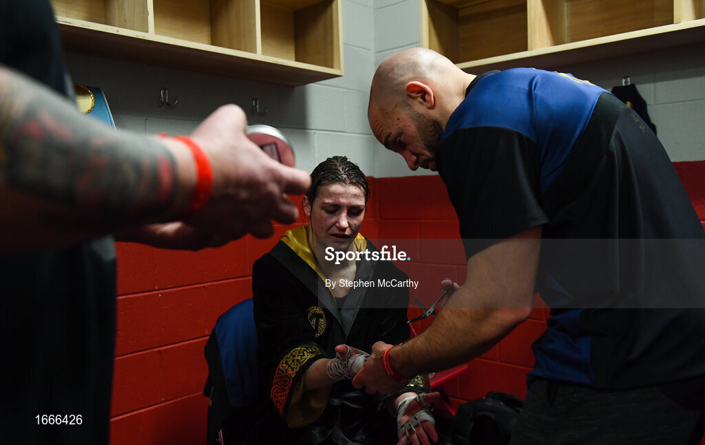 15 March 2019; Katie Taylor in her dressing room with her coach Ross Enamait after defeating Rose Volante in their WBA, IBF & WBO Female Lightweight World Championships unification bout at the Liacouras Center in Philadelphia, USA. Photo by Stephen McCarthy / Sportsfile