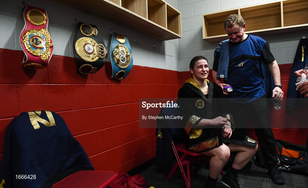 15 March 2019; Katie Taylor relaxes in her dressing room with manager Brian Peters, after defeating Rose Volante in their WBA, IBF & WBO Female Lightweight World Championships unification bout at the Liacouras Center in Philadelphia, USA. Photo by Stephen McCarthy / Sportsfile