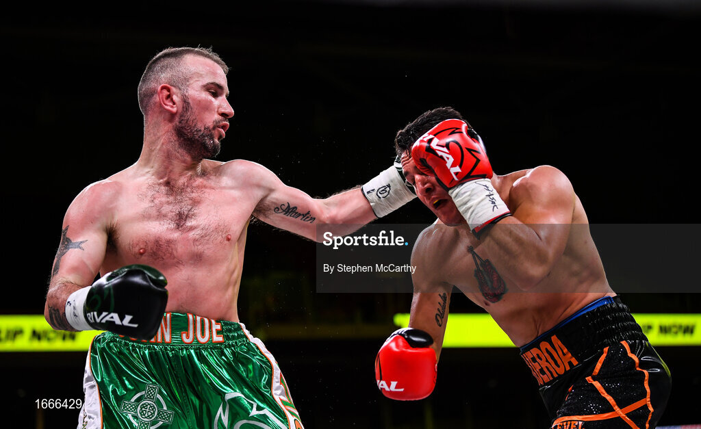 15 March 2019; John Joe Nevin, left, and Andres Figueroa during their lightweight contest at the Liacouras Center in Philadelphia, USA. Photo by Stephen McCarthy / Sportsfile