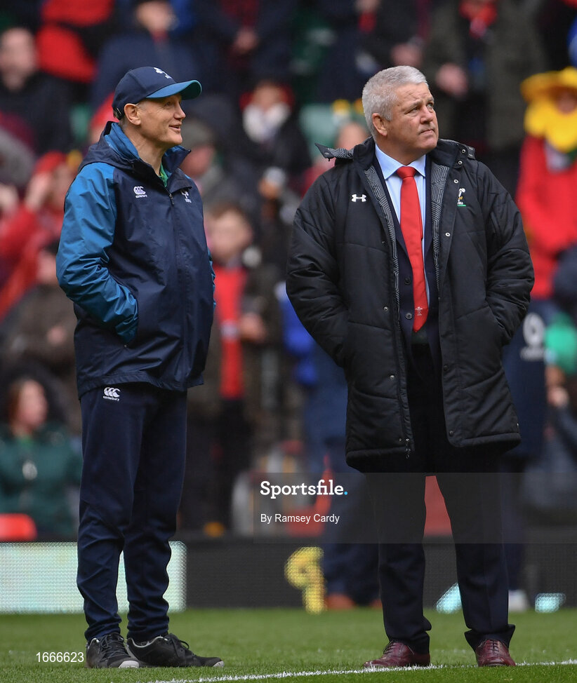 16 March 2019; Ireland head coach Joe Schmidt, left, in conversation with Wales head coach Warren Gatland ahead of the Guinness Six Nations Rugby Championship match between Wales and Ireland at the Principality Stadium in Cardiff, Wales. Photo by Ramsey Cardy/Sportsfile