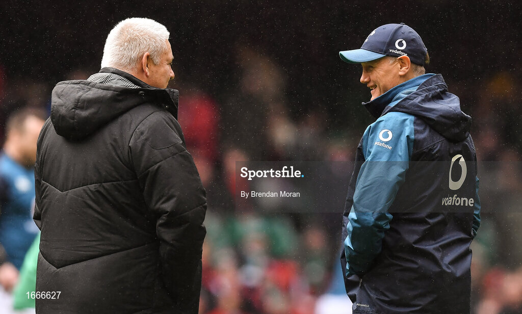 16 March 2019; Ireland head coach Joe Schmidt, right, with Wales head coach Warren Gatland prior to the Guinness Six Nations Rugby Championship match between Wales and Ireland at the Principality Stadium in Cardiff, Wales. Photo by Brendan Moran/Sportsfile