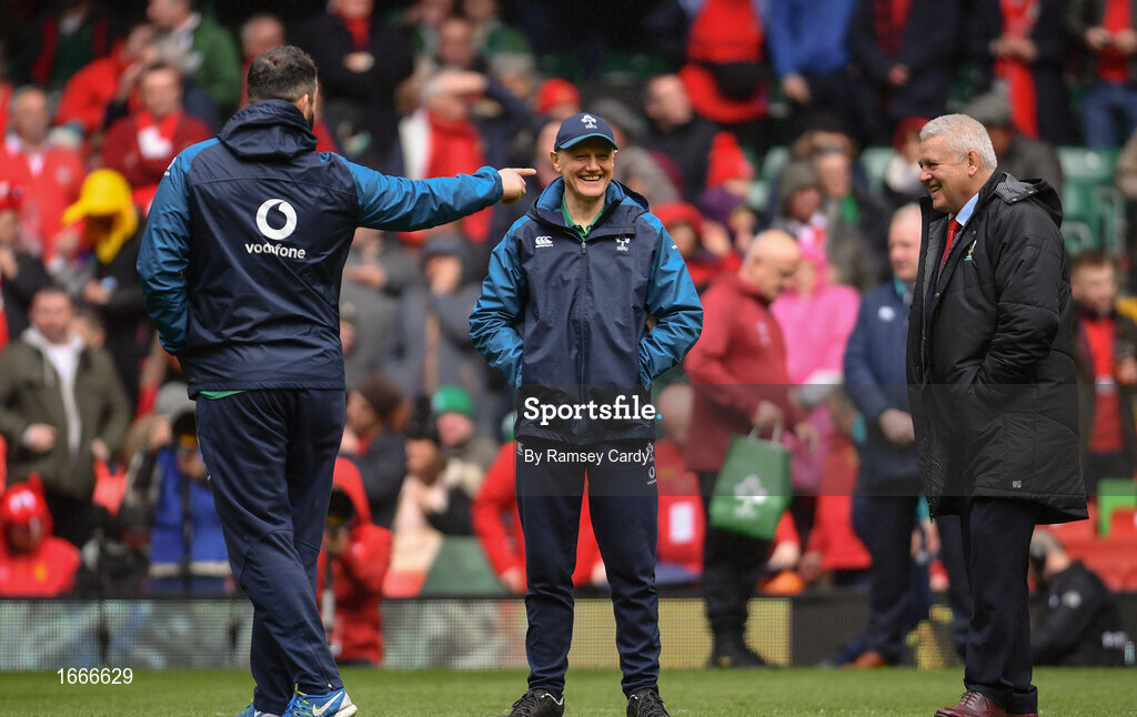 16 March 2019; Ireland head coach Joe Schmidt, second left, and defence coach Andy Farrell in conversation with Wales head coach Warren Gatland ahead of the Guinness Six Nations Rugby Championship match between Wales and Ireland at the Principality Stadium in Cardiff, Wales. Photo by Ramsey Cardy/Sportsfile