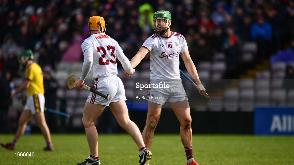 16 March 2019; Niall Burke of Galway, right, celebrates after scoring their side’s second goal with team-mate Davy Glennon during the Allianz Hurling League Division 1 Quarter-Final match between Galway and Wexford at Pearse Stadium in Salthill, Galway. Photo by Sam Barnes/Sportsfile