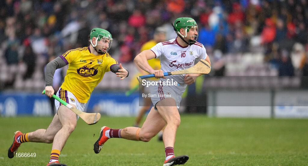 16 March 2019; Niall Burke of Galway in action against Darren Byrne of Wexford during the Allianz Hurling League Division 1 Quarter-Final match between Galway and Wexford at Pearse Stadium in Salthill, Galway. Photo by Sam Barnes/Sportsfile
