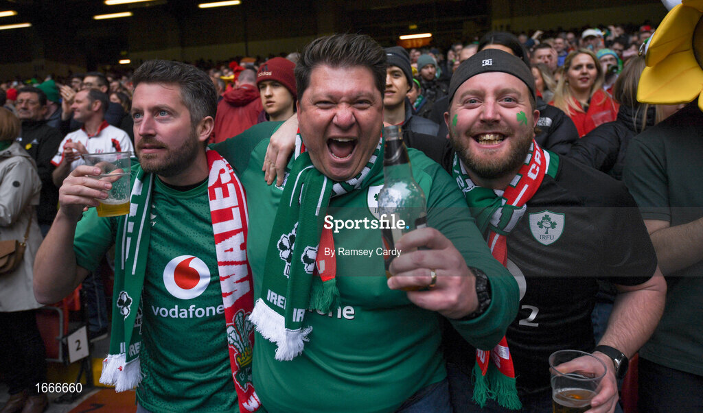 16 March 2019; Ireland supporters during the Guinness Six Nations Rugby Championship match between Wales and Ireland at the Principality Stadium in Cardiff, Wales. Photo by Ramsey Cardy/Sportsfile