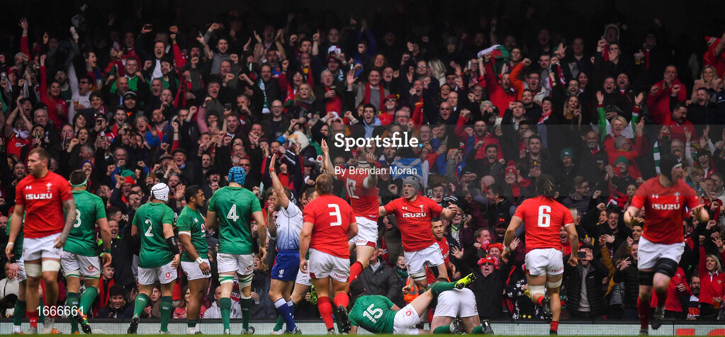 16 March 2019; Hadleigh Parkes of Wales (12) celebrates after scoring his side's first try during the Guinness Six Nations Rugby Championship match between Wales and Ireland at the Principality Stadium in Cardiff, Wales. Photo by Brendan Moran/Sportsfile