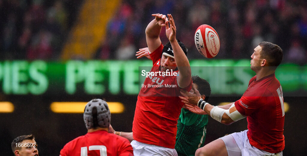 16 March 2019; Adam Beard of Wales jumps for the ball with Jacob Stockdale of Ireland during the Guinness Six Nations Rugby Championship match between Wales and Ireland at the Principality Stadium in Cardiff, Wales. Photo by Brendan Moran/Sportsfile
