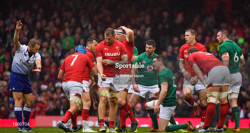 16 March 2019; Referee Angus Gardner awards a penalty to Wales for not releasing the ball during the Guinness Six Nations Rugby Championship match between Wales and Ireland at the Principality Stadium in Cardiff, Wales. Photo by Brendan Moran/Sportsfile