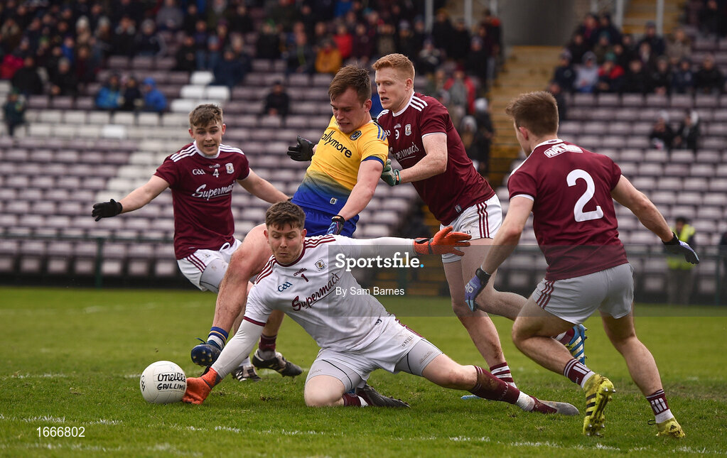 16 March 2019; Enda Smith of Roscommon in action against, from left, David Wynne, Ciarán Duggan, Ruairí Lavelle and Eoghan Kerin of Galway during the Allianz Football League Division 1 Round 6 match between Galway and Roscommon at Pearse Stadium in Salthill, Galway. Photo by Sam Barnes/Sportsfile
