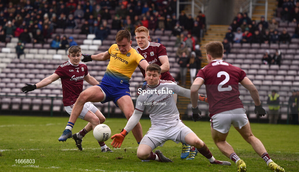 16 March 2019; Enda Smith of Roscommon in action against, from left, David Wynne, Ciarán Duggan, Ruairí Lavelle and Eoghan Kerin of Galway during the Allianz Football League Division 1 Round 6 match between Galway and Roscommon at Pearse Stadium in Salthill, Galway. Photo by Sam Barnes/Sportsfile