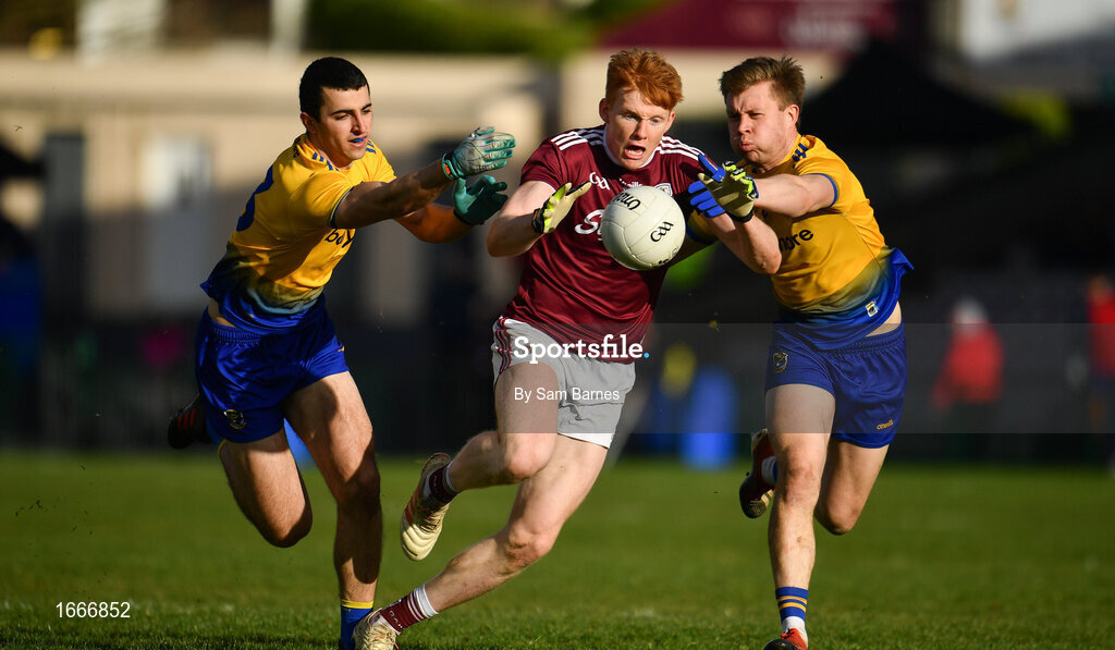 16 March 2019; Peter Cooke of Galway in action against Ciaran Lennon, left, and Niall Daly of Roscommon during the Allianz Football League Division 1 Round 6 match between Galway and Roscommon at Pearse Stadium in Salthill, Galway. Photo by Sam Barnes/Sportsfile