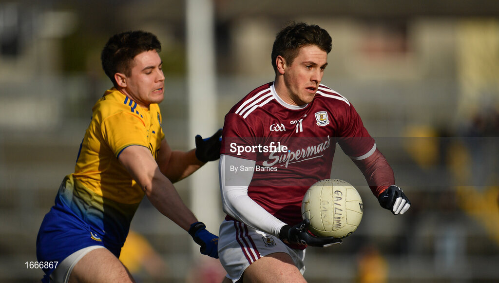 16 March 2019; Shane Walsh of Galway in action against Conor Daly of Roscommon during the Allianz Football League Division 1 Round 6 match between Galway and Roscommon at Pearse Stadium in Salthill, Galway. Photo by Sam Barnes/Sportsfile