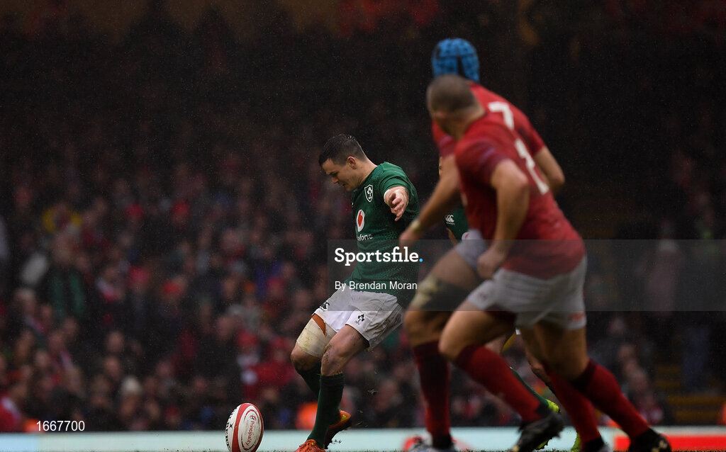 16 March 2019; Jonathan Sexton of Ireland kicks a restart during the Guinness Six Nations Rugby Championship match between Wales and Ireland at the Principality Stadium in Cardiff, Wales. Photo by Brendan Moran/Sportsfile