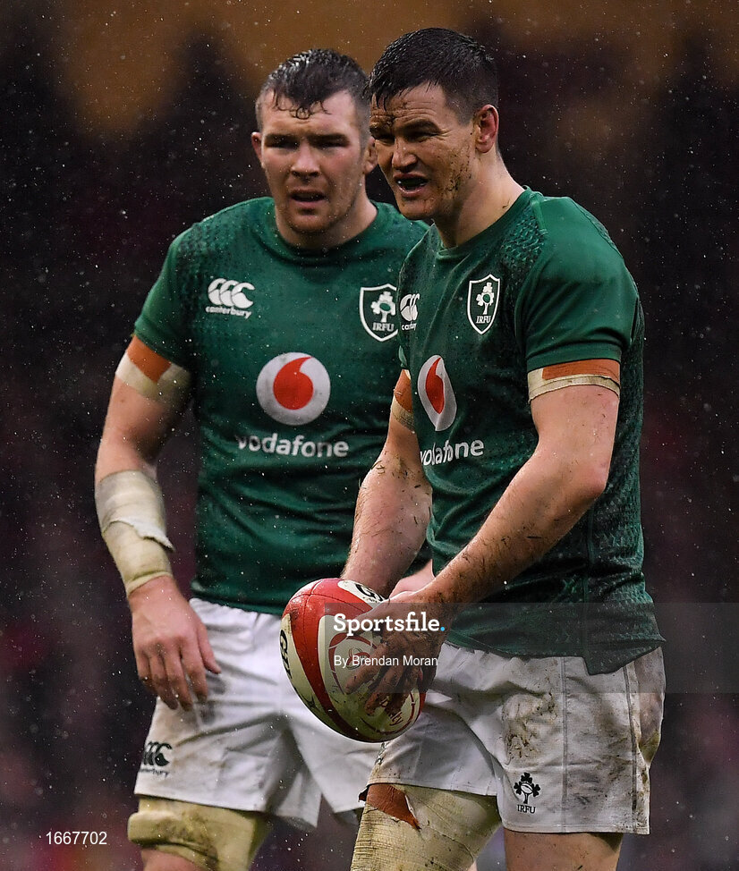 16 March 2019; Jonathan Sexton, right, and Peter O’Mahony of Ireland during the Guinness Six Nations Rugby Championship match between Wales and Ireland at the Principality Stadium in Cardiff, Wales. Photo by Brendan Moran/Sportsfile