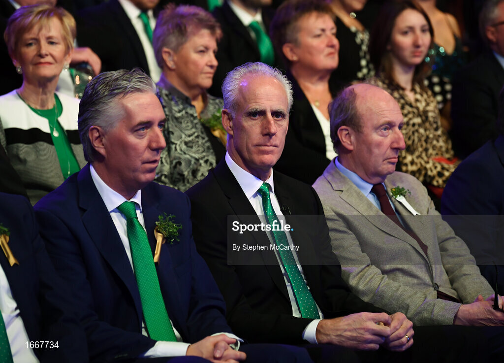 17 March 2019; John Delaney, CEO, Football Association of Ireland, Republic of Ireland manager Mick McCarthy and Minister for Transport, Tourism and Sport, Shane Ross T.D. at the Three FAI International Awards at RTE Studios in Donnybrook, Dublin. Photo by Stephen McCarthy/Sportsfile