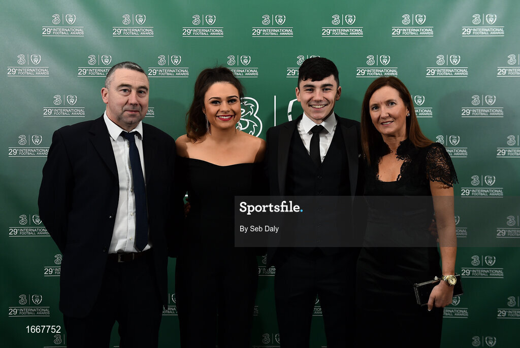 17 March 2019; Republic of Ireland Under 19s Liam Kerrigan, centre, with father Andy, Ali Dykes, and mother Catriona prior to the Three FAI International Awards at RTE Studios in Donnybrook, Dublin. Photo by Seb Daly/Sportsfile